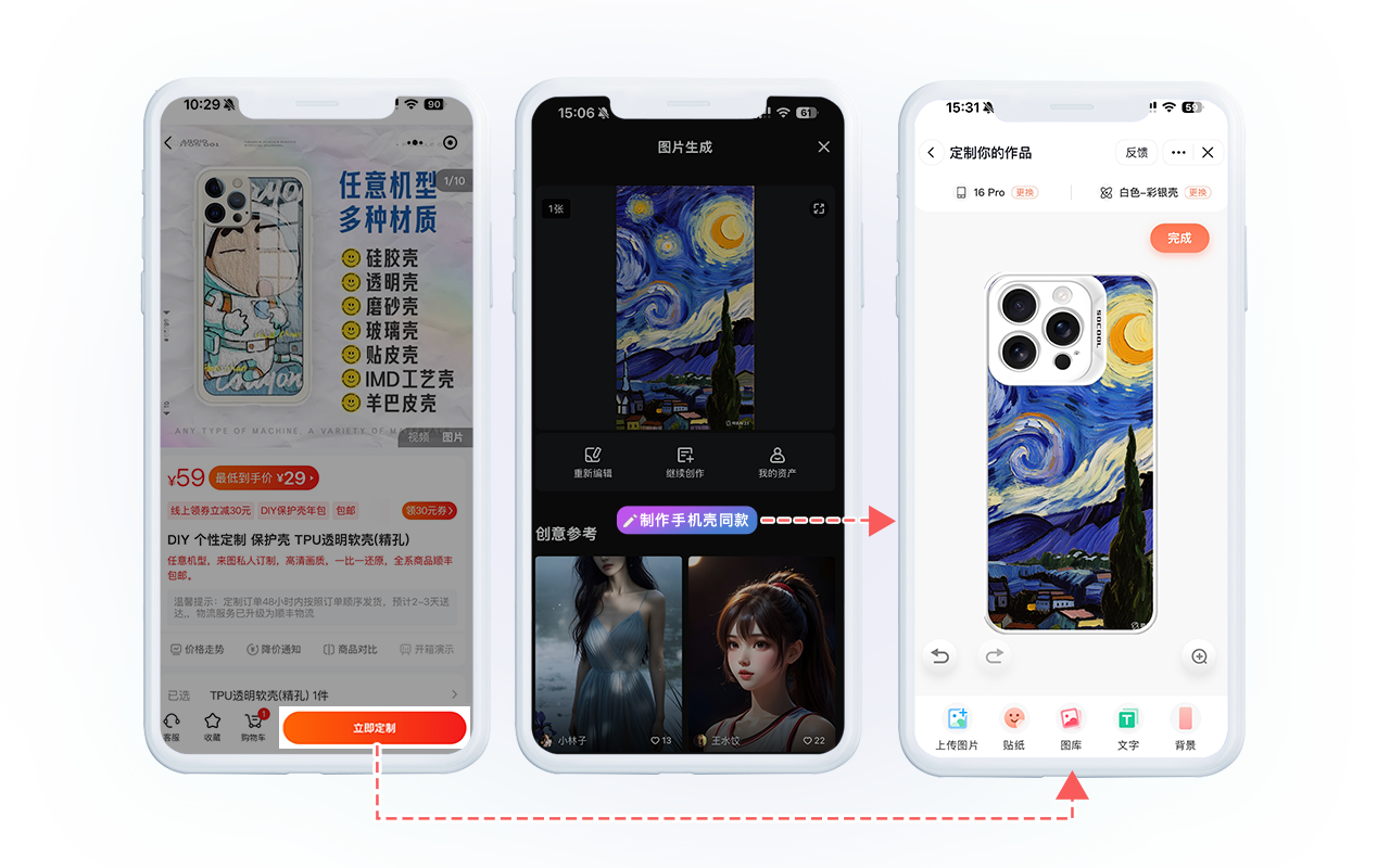 在各大電商平臺賣手機殼,可直接訂購來火定制,簡單配置后即可嵌入購物流程,讓用戶一鍵定制,無需復雜開發